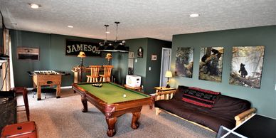 In the  Basement Game Room there is a bar and a 55” flat screen ROKU TV, to keep an eye on your favorite sport while playing a game of pool or while enjoying the other games with the whole family.