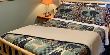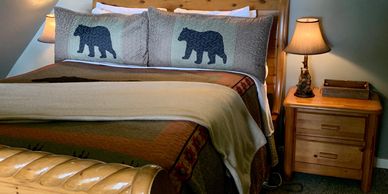 The downstairs bedroom in the main cabin has a queen bed and has a bathroom with shower attached.