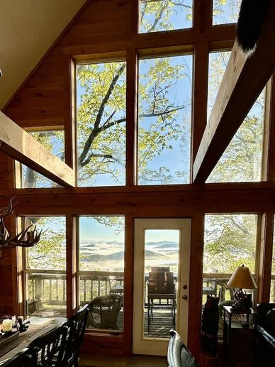 The second bedroom in the main cabin is in the loft area which has amazing views right out across the BlueRidge Mountains into the Great Smokey mountains of Tennessee as far as the eye can see. There is also a private bathroom with a shower in the loft bedroom.
